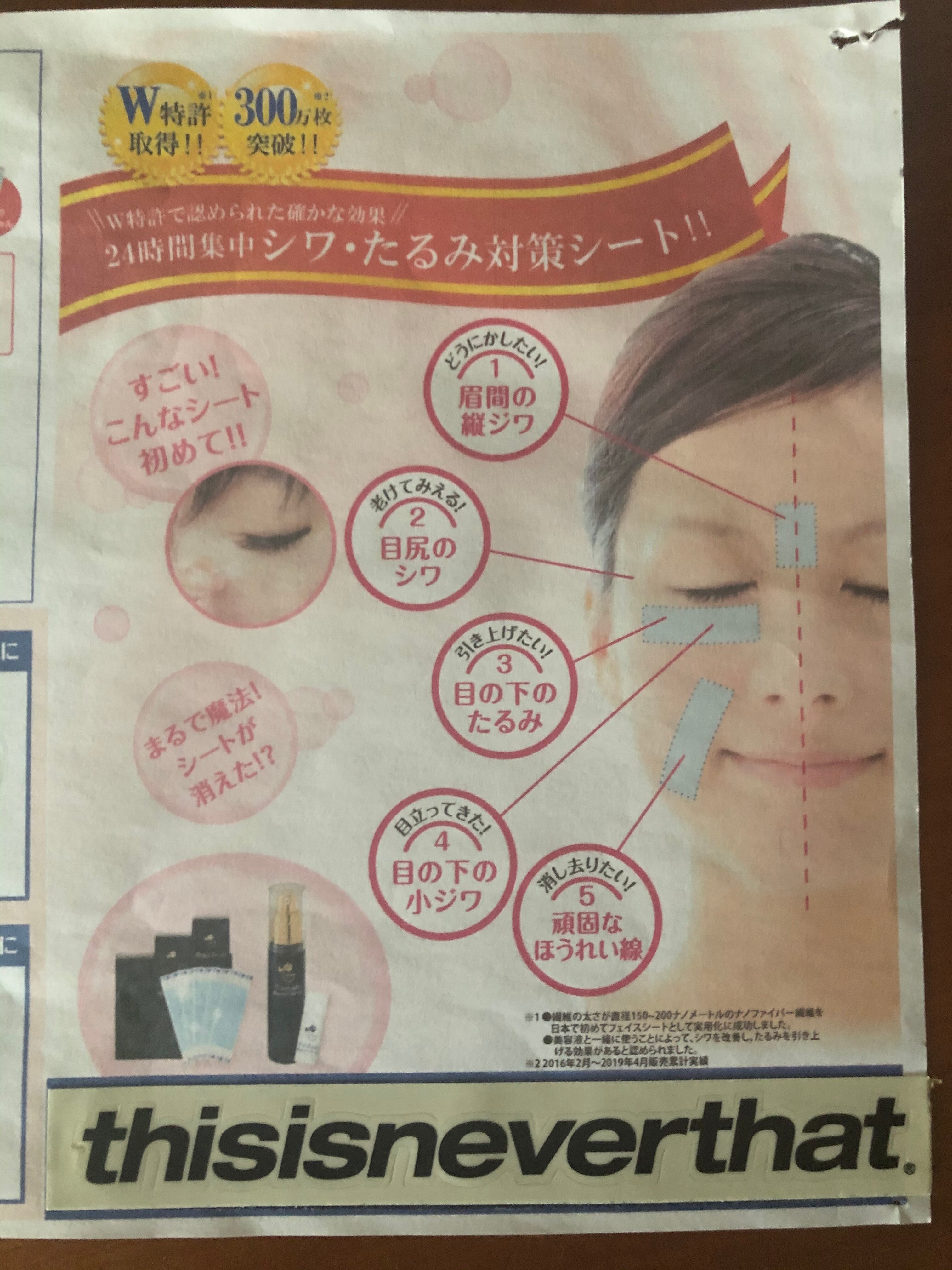 目の下のこじわ、クマ、脂肪だれ、ほうれい線や眉間のシワなどにセラムを塗り特許取得のナノシートを貼るだけで今までの悩みがウソの様に!