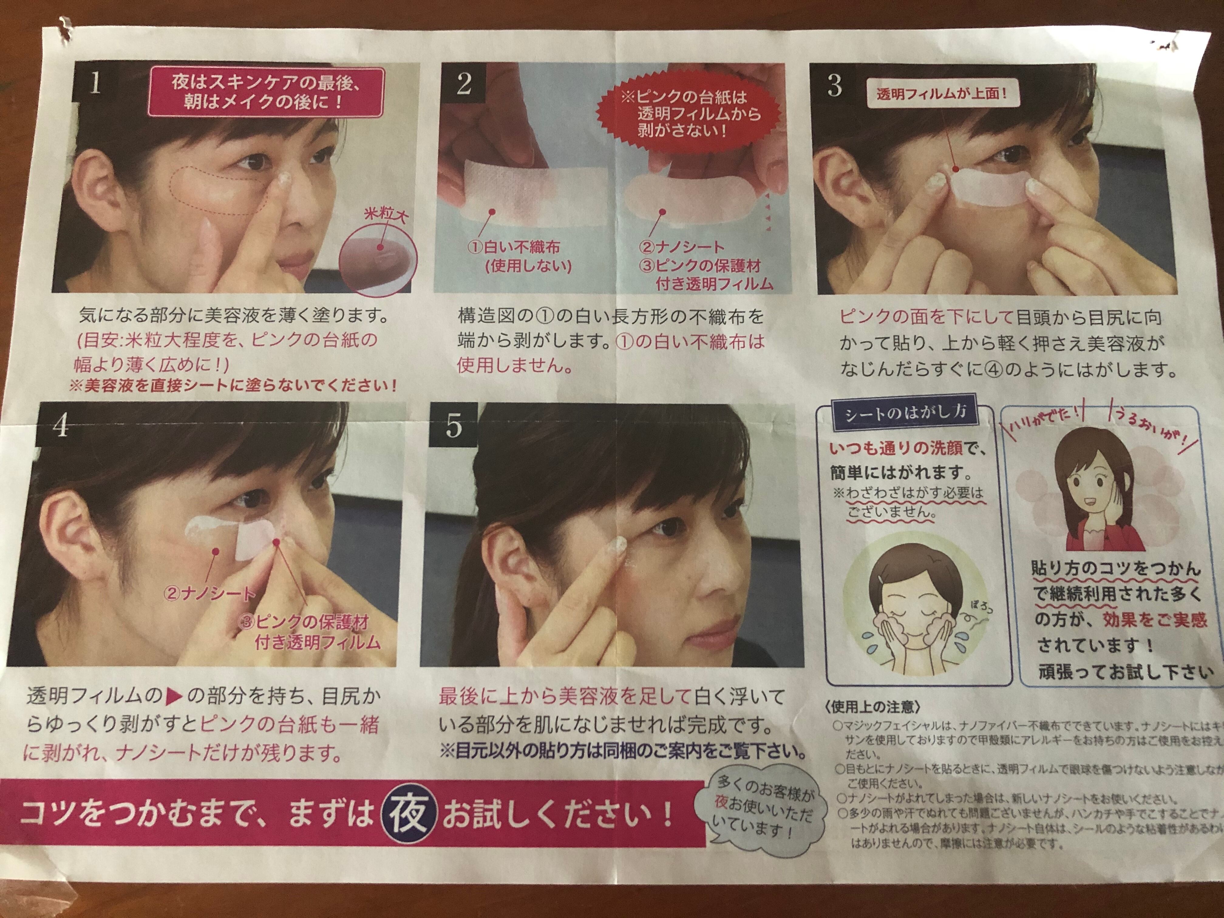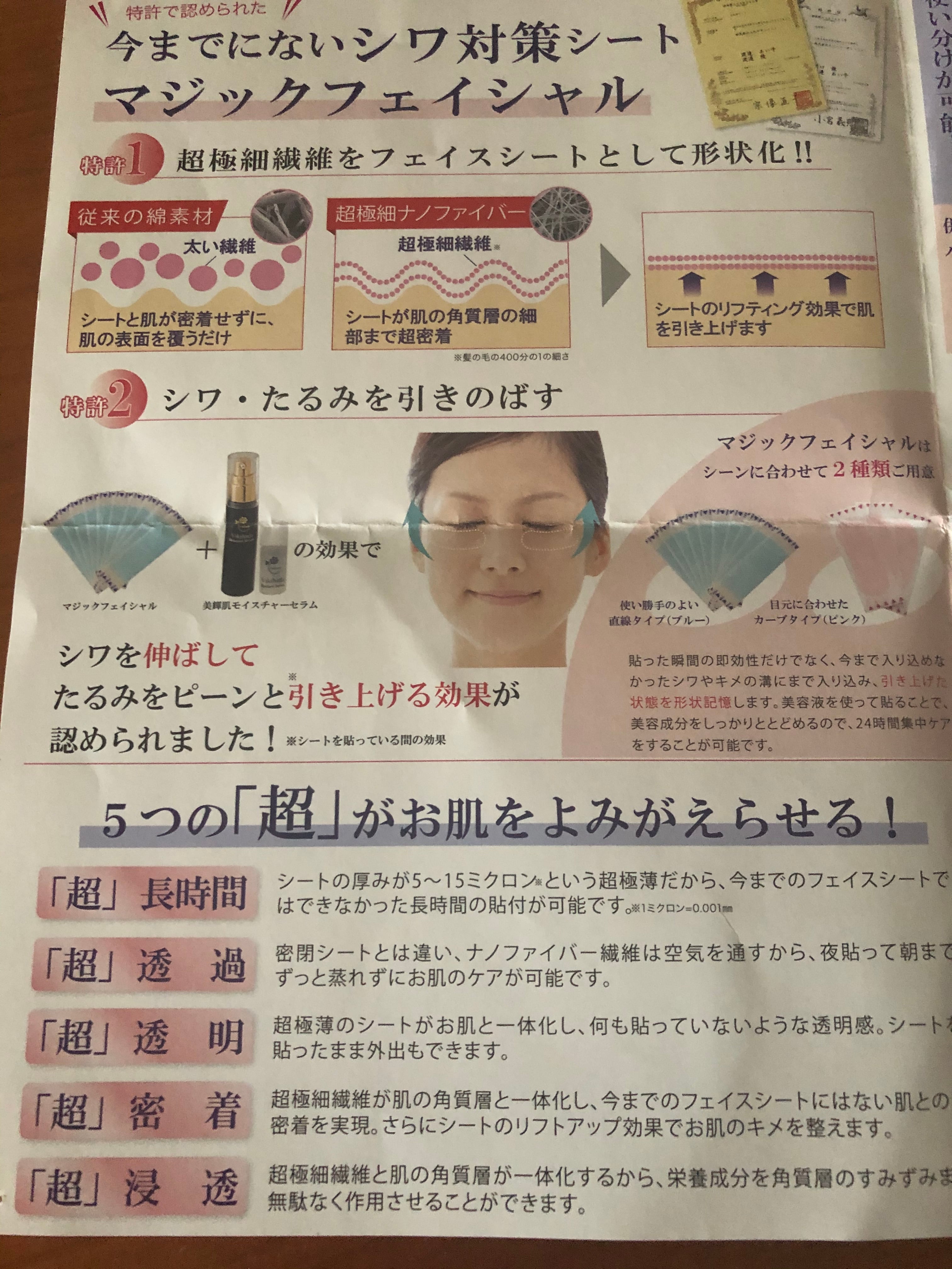 マジックフェイスシートは特徴として、就寝時の集中保湿による「改善力」だけでなく、日中メイクの上から貼ることもでき、シワやたるみを目立たなくさせる「即効性」もあります。
